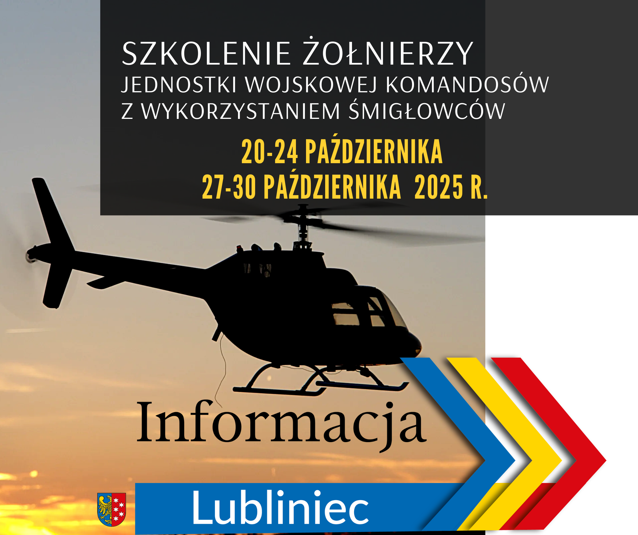 Jednostka Wojskowa Komandosów w Lublińcu informuje, że w dniach 20-24 października oraz 27-30 października 2025 roku na terenie Jednostki Wojskowej 4101 oraz powiatu lublinieckiego prowadzone będą szkolenia spadochronowe i taktyczne z udziałem śmigłowców.