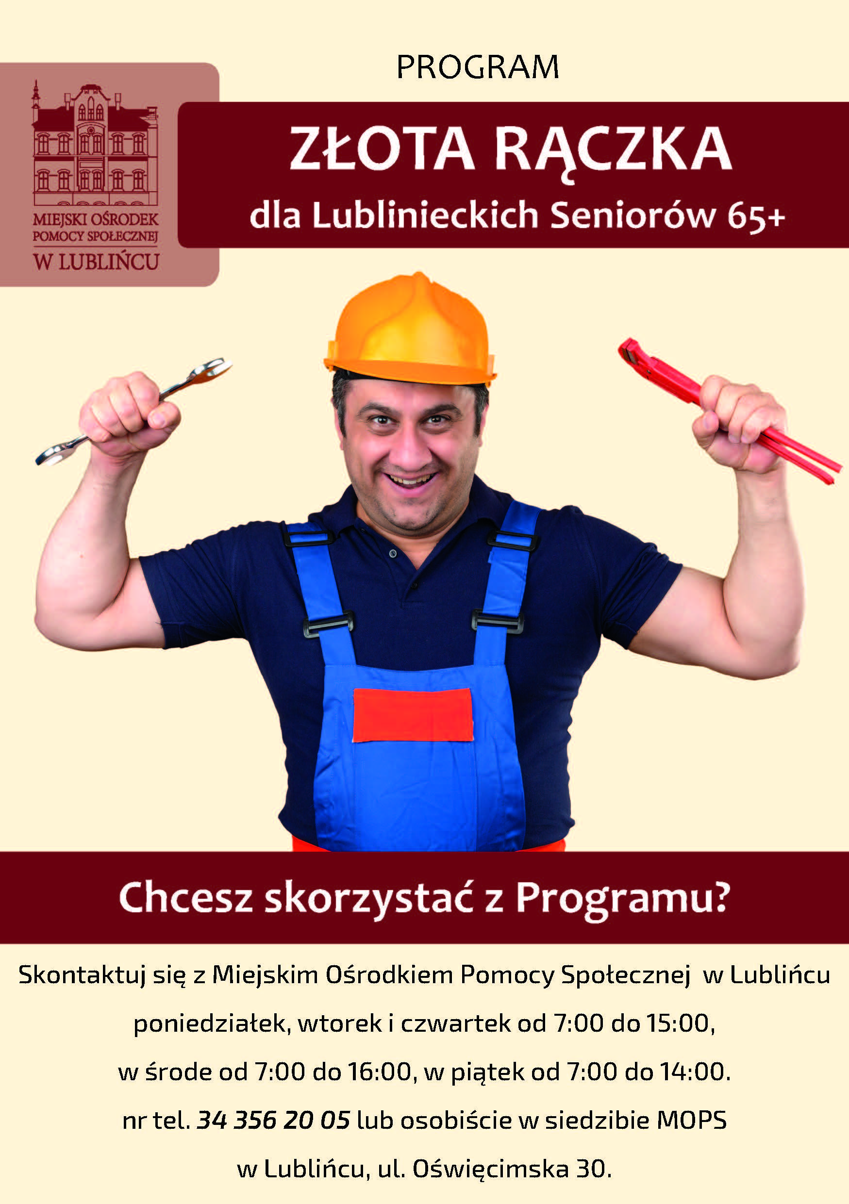 Miejski Ośrodek Pomocy Społecznej w Lublińcu już czwarty rok z rzędu realizuje pomocowy program: „Złota Rączka dla Lublinieckich Seniorów 65+" na rok 2026  i zaprasza lublinieckich seniorów do skorzystania z nieodpłatnej pomocy w drobnych, domowych naprawach, których nie są w stanie samodzielnie usunąć. Program skierowany jest dla lublinieckich seniorów w wieku 65 lat i starszych, samotnych (także samotne małżeństwa), nieposiadających najbliższej rodziny (zstępnych) na terenie miasta Lublińca, którzy na stałe zamieszkują w lokalu, w którym realizowana będzie usługa naprawcza.
