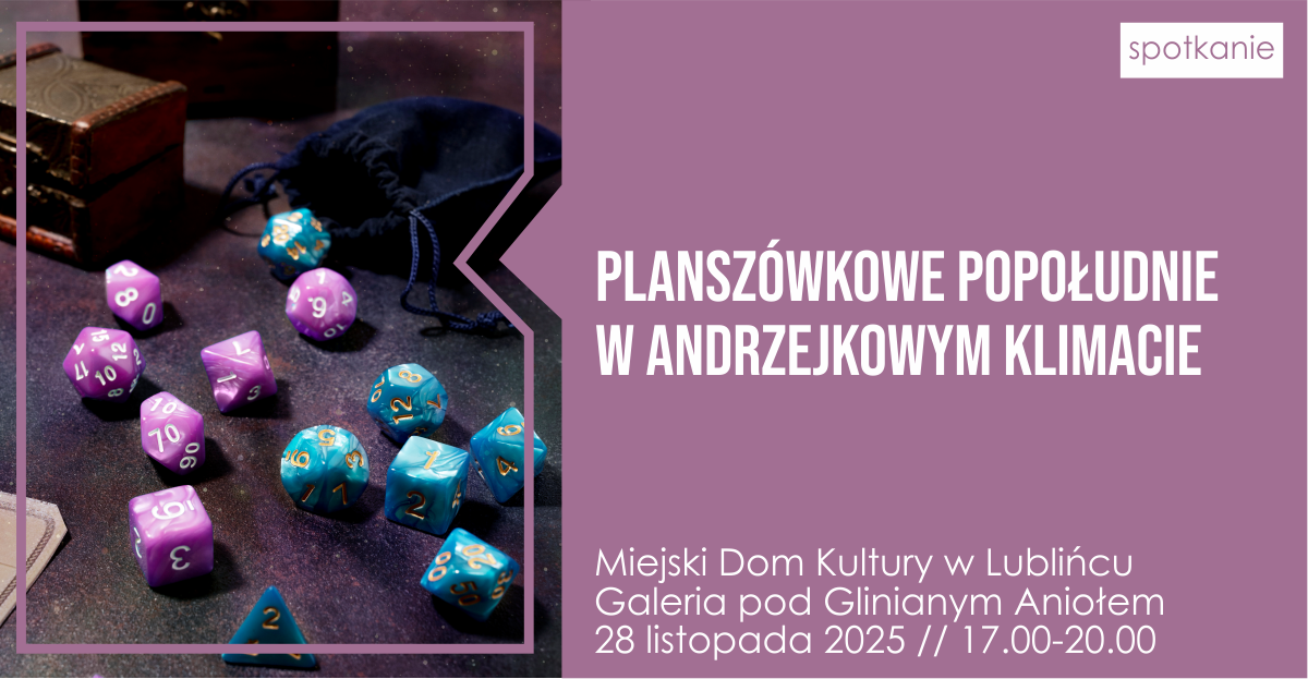 28 listopada 2025 roku zapraszamy na Planszówkowe Popołudnie w andrzejkowym stylu, które odbędzie się w godzinach 17:00-20:00 w Galerii pod Glinianym Aniołem w Lublińcu.