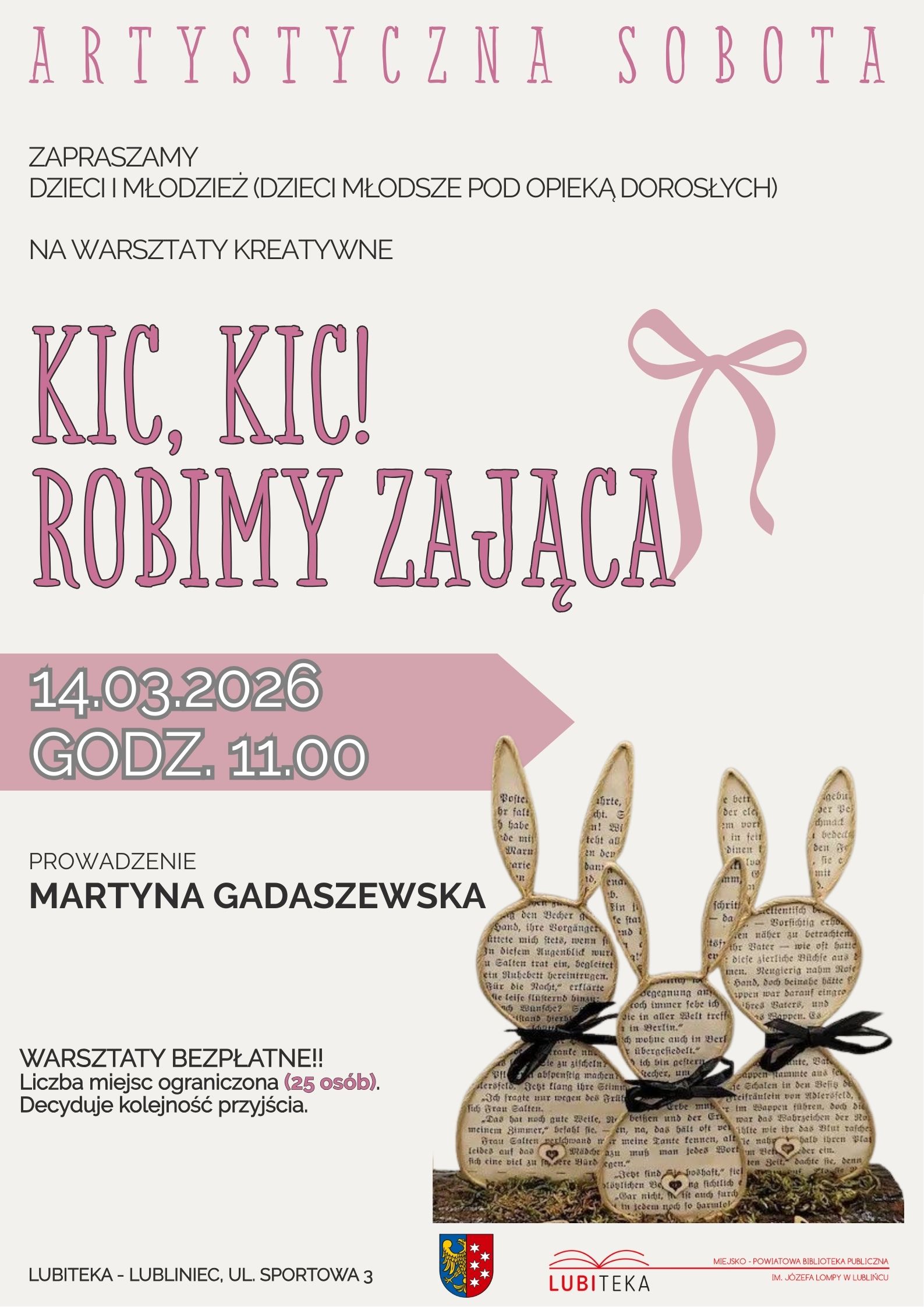 #ArtystycznaSobota #Lubiteka #Lubliniec #KreatywneWarsztaty #Wielkanoc2026 #ZajączekWielkanocny #TwórczaZabawa #RodzinneChwile #KulturaDlaDzieci #MartynaGadaszewska