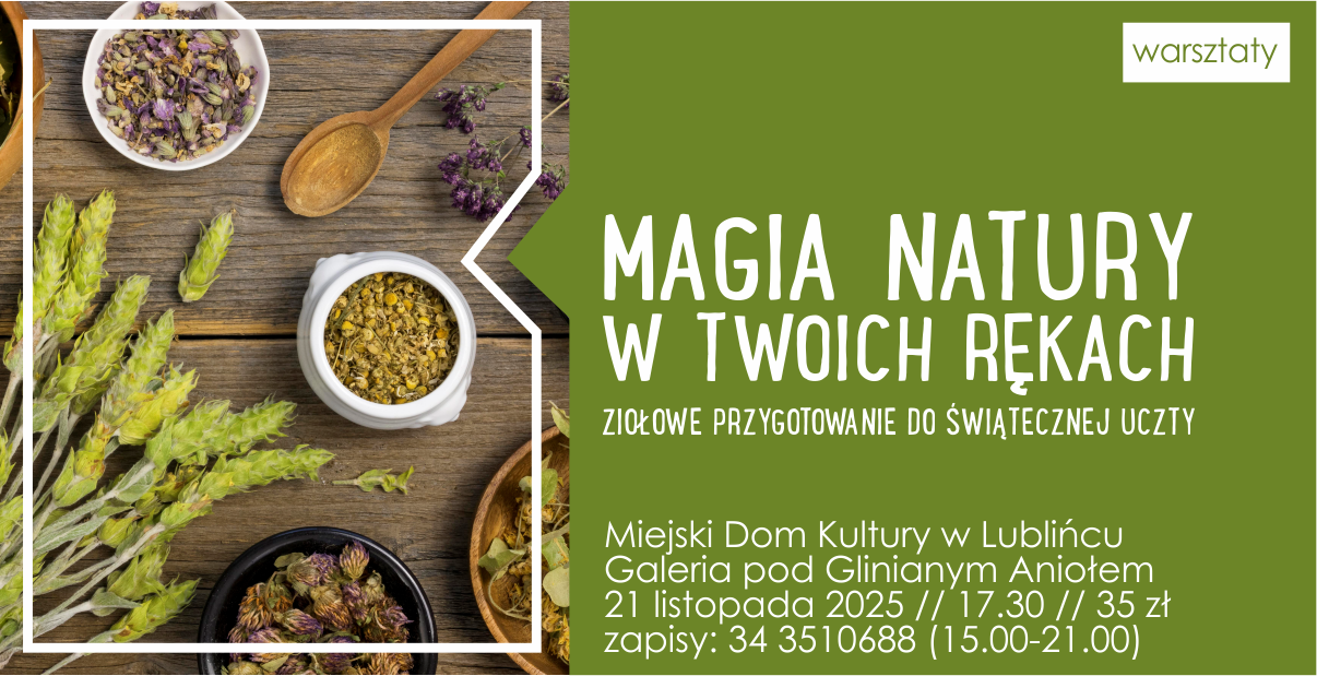 Zapraszamy na kolejne warsztaty ,,Magia natury w twoich rękach”, które odbędą się 21 listopada o godzinie 17:30 w Miejskim Domu Kultury w Lublińcu. Koszt udziału w warsztatach 35 złotych. Na warsztaty zapisać można się telefonicznie pod numerem 34/351 06 88 lub w Galerii pod Glinianym Aniołem w godzinach 15:00-21:00.