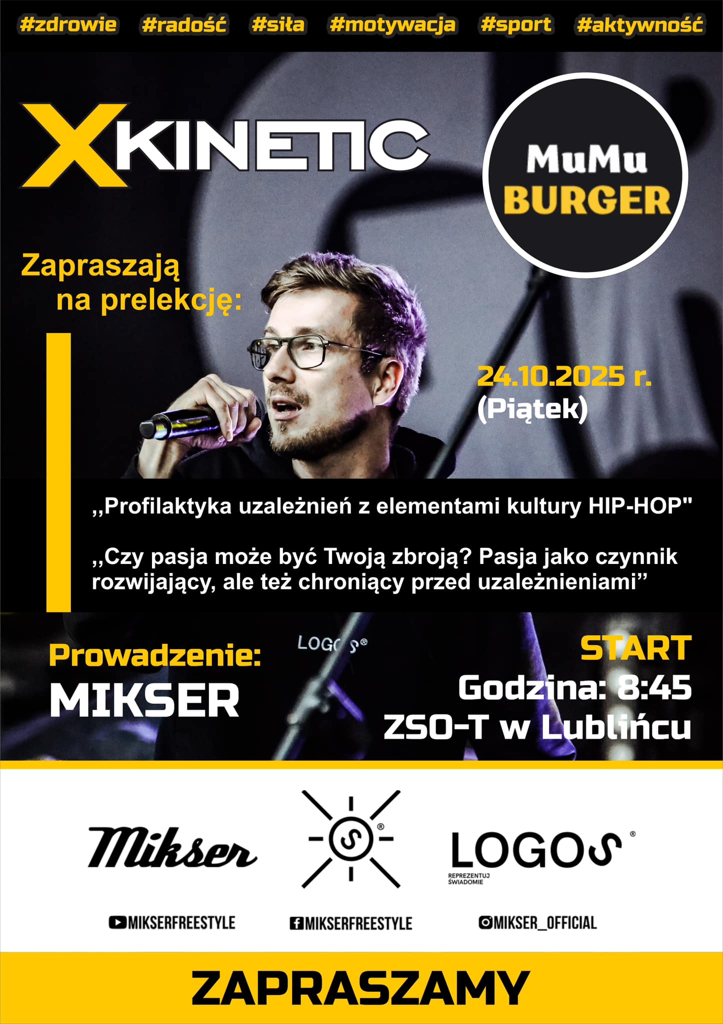 Prelekcja prowadzona przez Miksera "profilaktyka uzależnień z elementami hip-hop" "Czy pasja może być twoją zbroją?" start o 8:45 w ZSO-T
