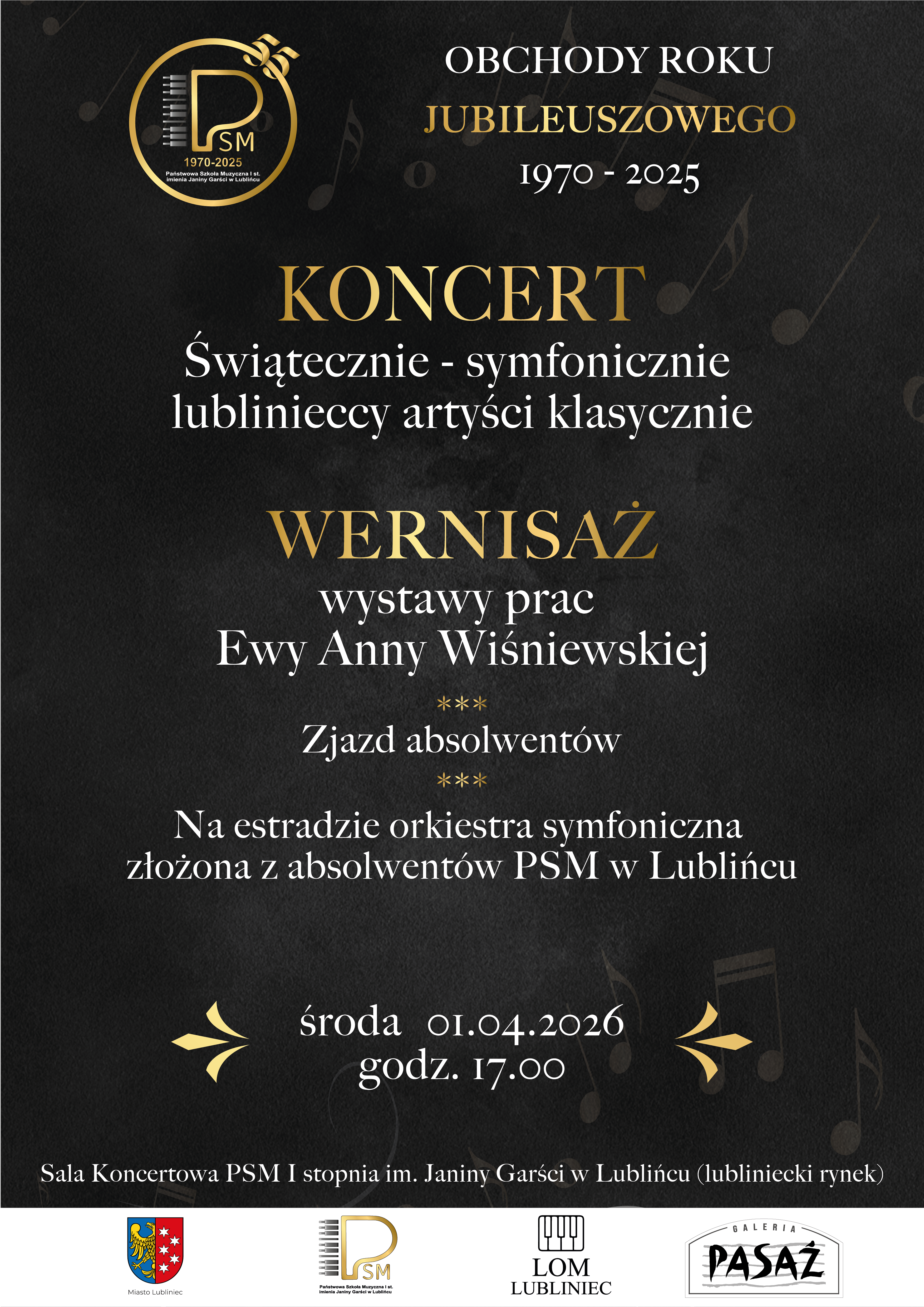 Zapraszamy na wielkie muzyczne - artystyczne święto połączone ze zjazdem absolwentów. 1 kwietnia 2026 , środa, w Państwowej Szkole Muzycznej I stopnia im. Janiny Garści w Lublińcu wystąpią absolwenci w różnych konfiguracjach instrumentalnych, m.in wystąpi: oktet wiolonczelowy, kwintet fletowa, Poland Brass, orkiestra smyczkowa, orkiestra symfoniczna. Na scenie artyści na co dzień grający w NOSPR, Filharmonii Śląskiej, Filharmonii Częstochowskiej, Filharmonii Opolskiej, Filharmonii Kaliskiej, Dolnośląskiej Filharmonii w Jeleniej Górze, Warmińsko - Mazurskiej Filharmonii w Olsztynie, wielu muzyków solowych.