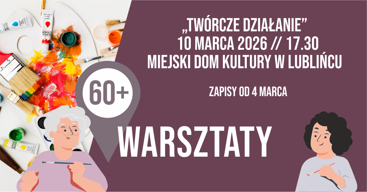 4 marca 2026 roku o godzinie 15:00 ruszają zapisy na warsztaty 60+ ,,Twórcze działanie”. Zapisać można się telefonicznie pod numerem 34/351 06 88 lub w Galerii pod Glinianym Aniołem w Lublińcu.