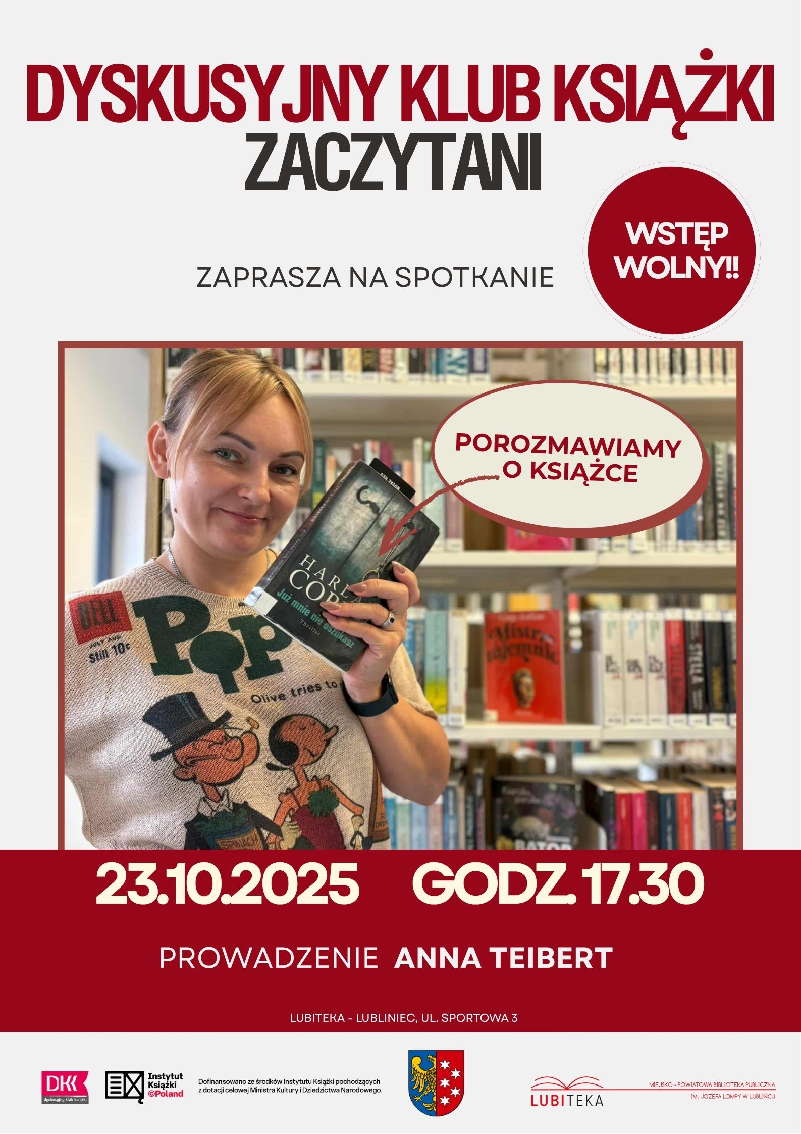 Już 23 października 2025 r. o godz. 17:30 w Lubitece w Lublińcu (ul. Sportowa 3) spotkamy się, by porozmawiać o elektryzującym thrillerze Harlana Cobena – „Już mnie nie oszukasz”! 🔍