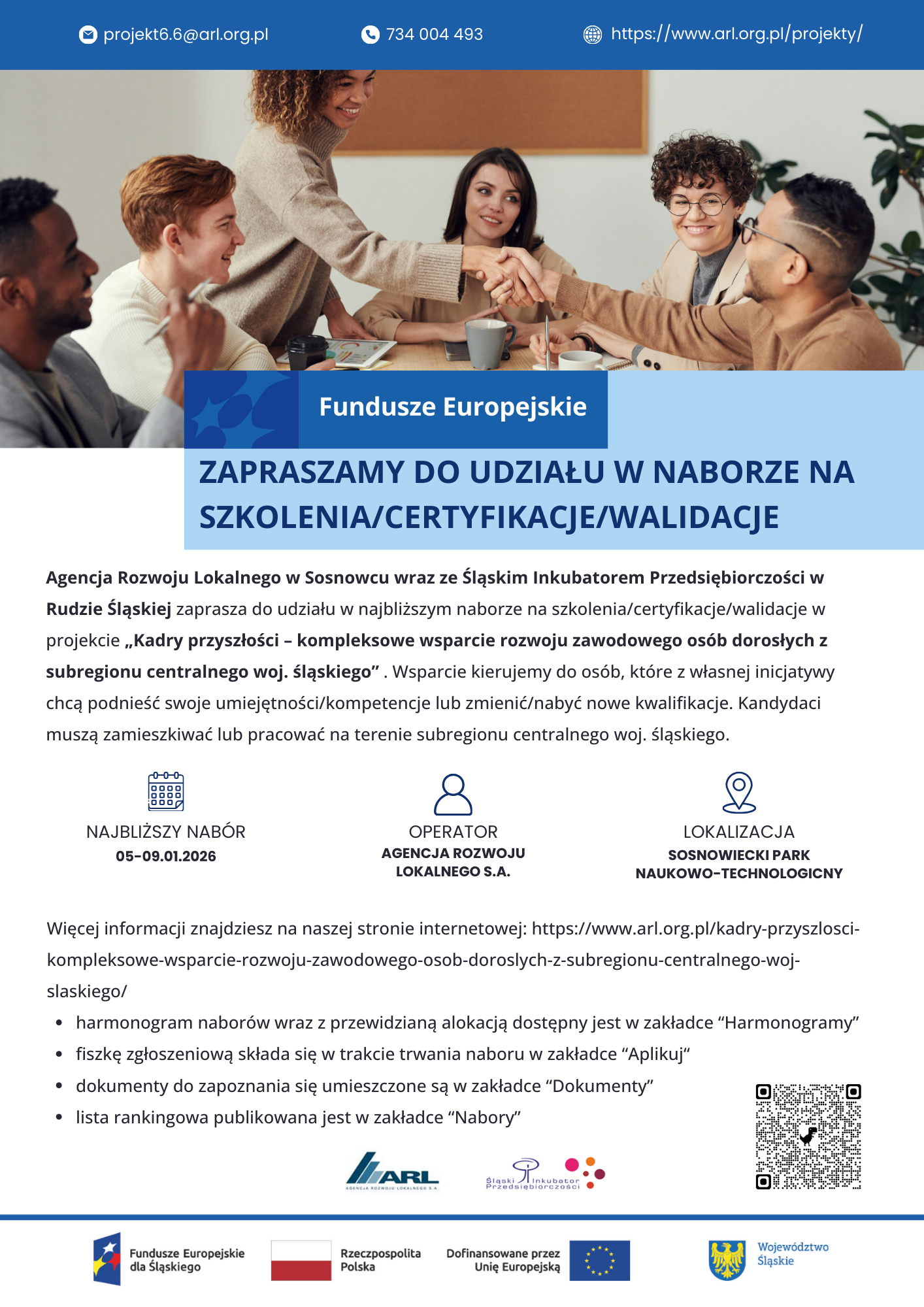 Agencja Rozwoju Lokalnego S.A. realizuje projekt „Kadry przyszłości – kompleksowe wsparcie rozwoju zawodowego osób dorosłych z subregionu centralnego woj. śląskiego”, współfinansowany ze środków Europejskiego Funduszu Społecznego Plus (EFS+), w ramach Programu Fundusze Europejskie dla Śląskiego 2021–2027, Działanie FESL.06.06 – Kształcenie osób dorosłych – EFS+.