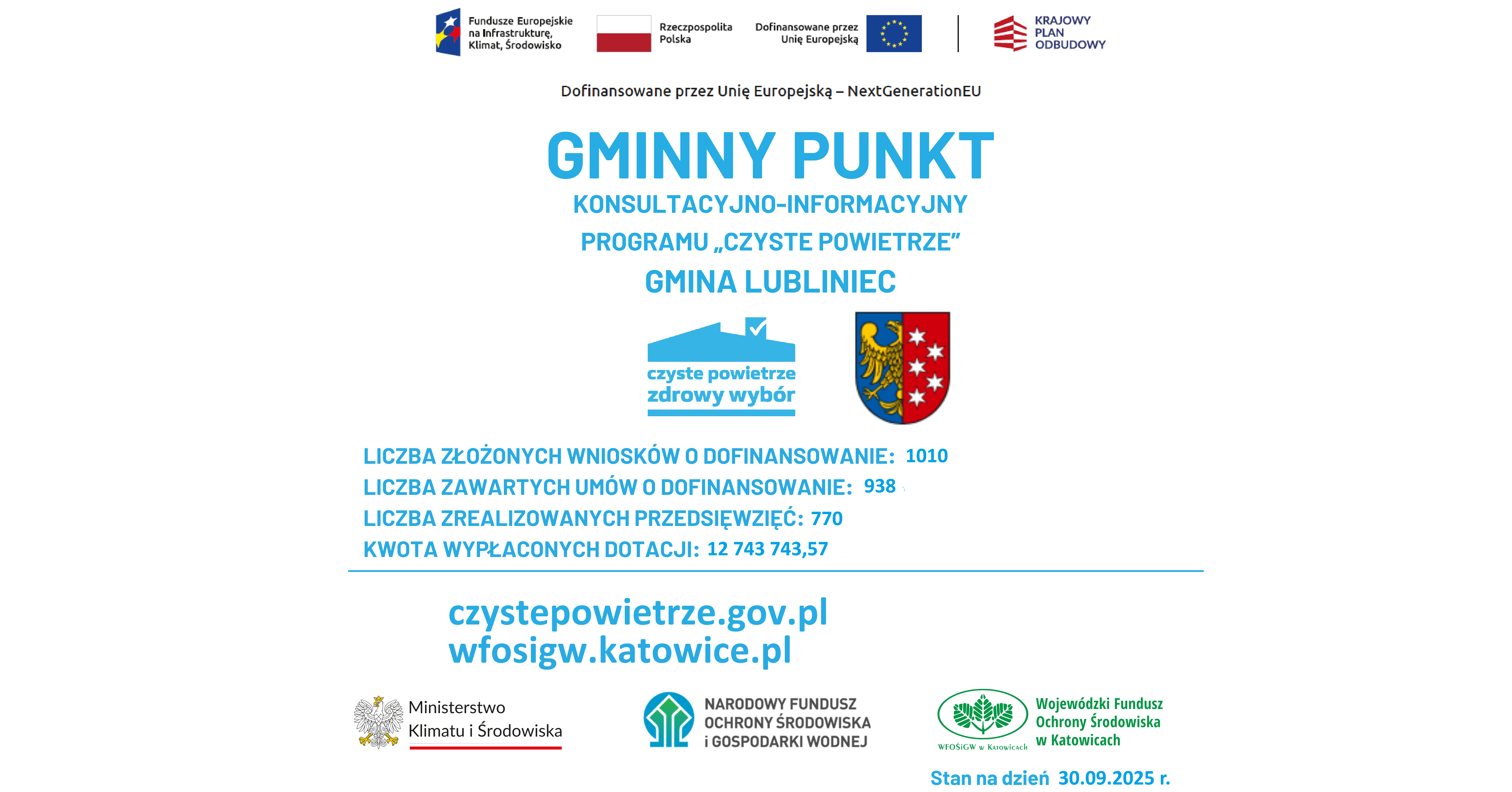Zapraszamy do odwiedzenia gminnego punktu konsultacyjno-informacyjnego programu "Czyste powietrze" mieszczącego się w Centrum Obsługi Mieszkańców Urzędu Miejskiego w Lublińcu przy ul. Paderewskiego 7a. Prowadzimy działania dla mieszkańców Lublińca w zakresie:
