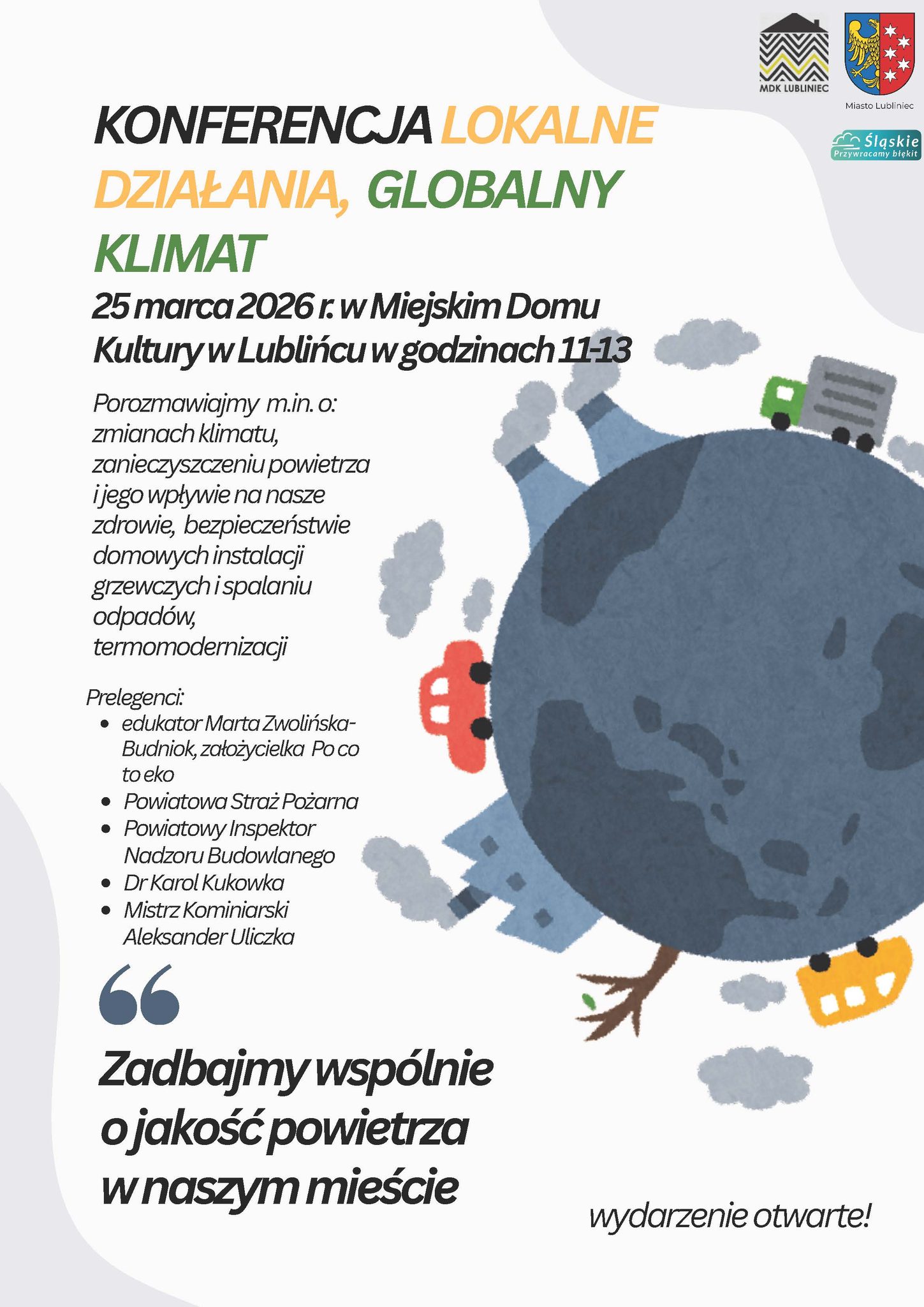 W dniu 25 marca br. zapraszamy do Miejskiego Domu Kultury w Lublińcu na konferencję poświęconą zmianom klimatu oraz działaniom na rzecz poprawy jakości powietrza w Mieście Lublińcu. Wydarzenie odbędzie się w godzinach 11:00–13:00.