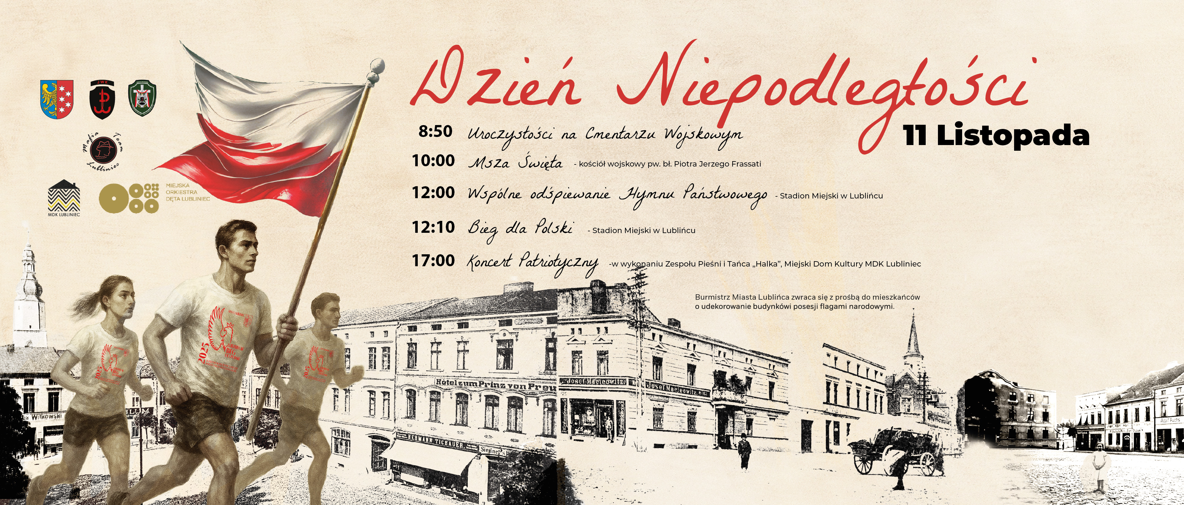 Burmistrz Miasta Lublińca serdecznie zaprasza do udziału w uroczystych obchodach Narodowego Święta Niepodległości, które rozpoczną się 11 listopada 2025 r. (wtorek) o godz. 8.50 na terenie Cmentarza Wojskowego w Lublińcu.