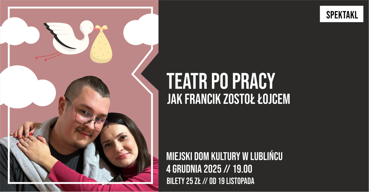 Po dłuższej przerwie zapraszamy na wyjątkowe wydarzenie teatralne, w którym nie zabraknie polsko-śląskich perypetii rodzinnych, humoru i wzruszeń. „Jak Francik zostoł łojcem!” to nowy spektakl lublinieckich aktorów amatorów, którzy na co dzień szlifują swój aktorski warsztat w Miejskim Domu Kultury. W przedstawieniu wezmą udział aktorzy pełni pasji, zaangażowania i tęsknoty za sceną. Długo czekaliśmy na ten moment. Z różnych życiowych powodów musieli zrobić przerwę, ale teraz z sercem na dłoni, wracają do tego, co kochają najbardziej. To dla nas duże wyzwanie, ale i też ogromna radość. Liczymy, że spotkanie z publicznością będzie, jak zawsze, serdeczne i wzruszające – mówią aktorzy Teatru po Pracy.
