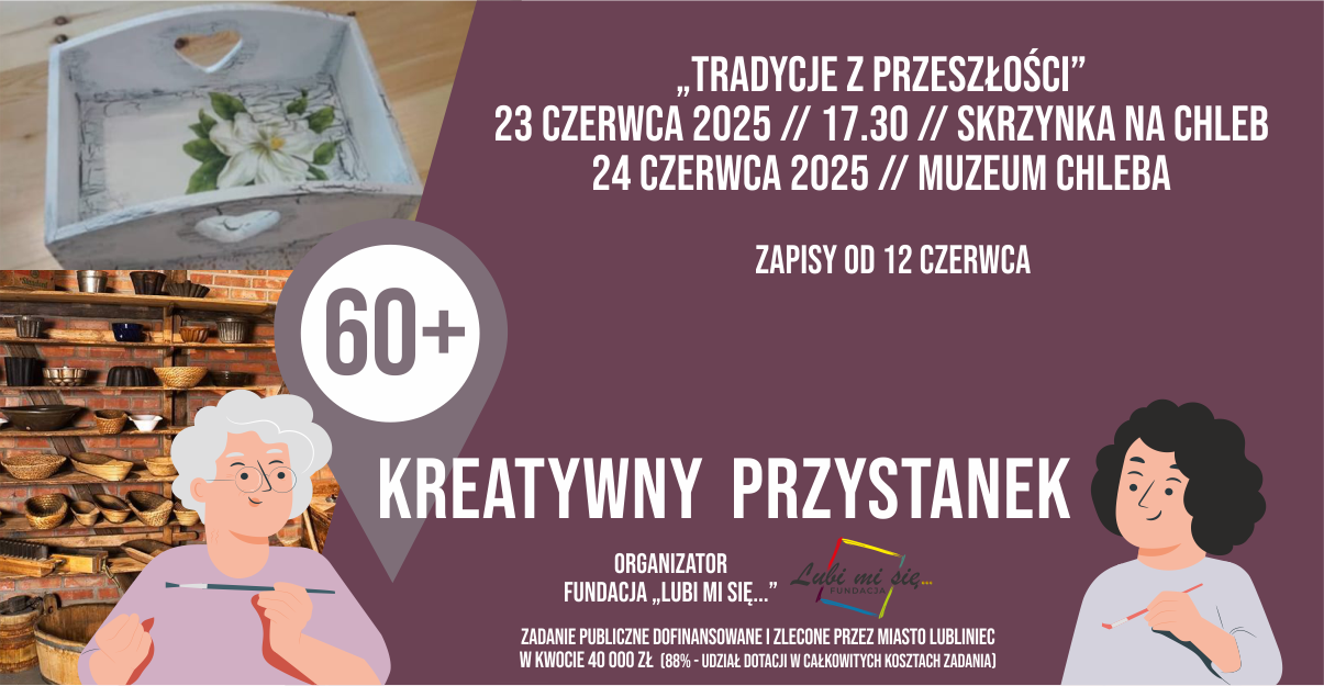 Cykl ,,Tradycje z przeszłości” odbędzie się w terminie 23 i 24 czerwca 2025 roku. 23 czerwca o godzinie 17:30 w Miejskim Domu Kultury w Lublińcu odbędą się warsztaty ,,Skrzynka na chleb”, które poprowadzi Marzena Grzyb. 24 czerwca będzie możliwość udziału w spotkaniu w Muzeum Chleba w Radzionkowie.