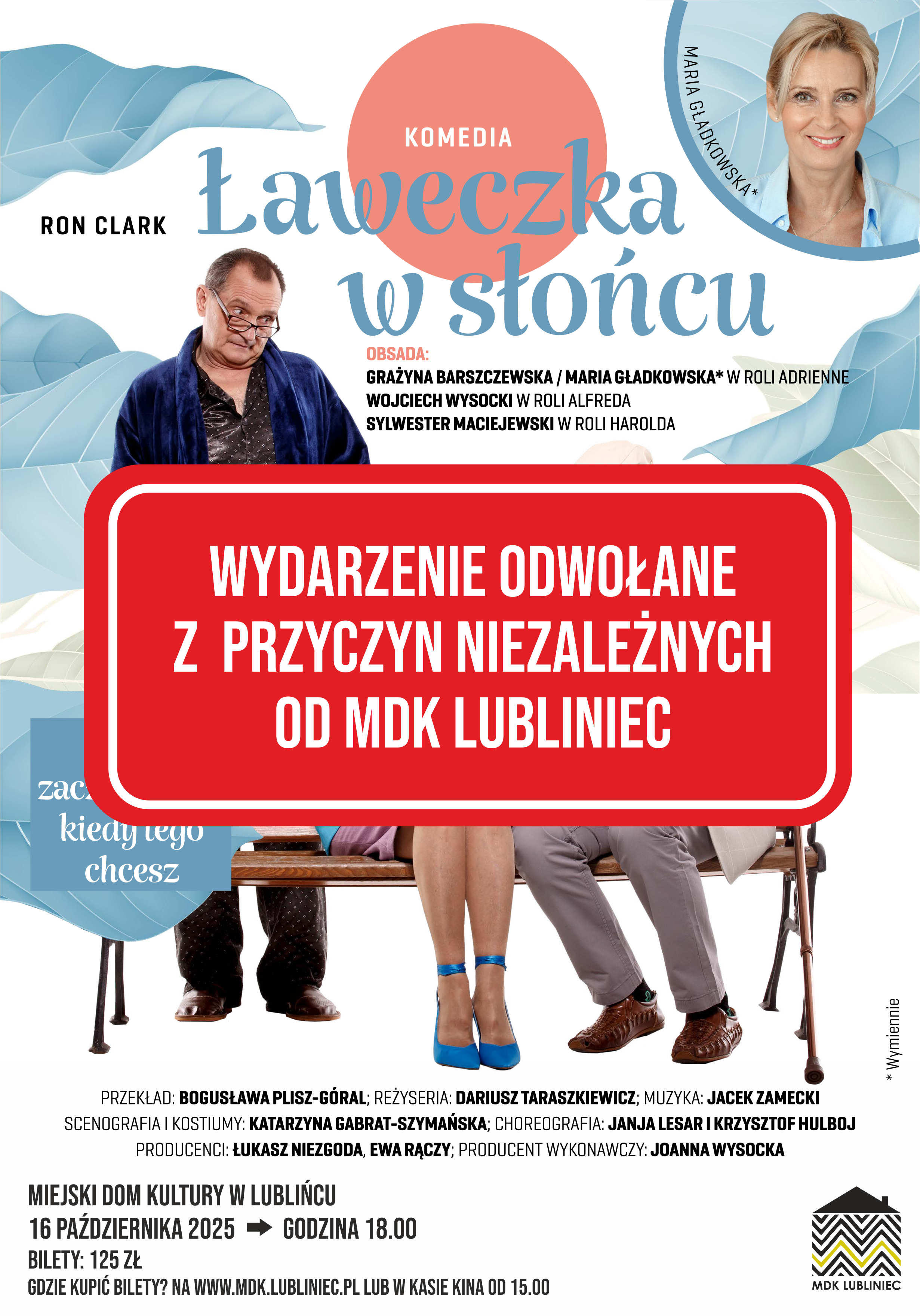 Z przyczyn niezależnych od MDK Lubliniec spektakl „ Ławeczka w Słońcu”, który miał odbyć się 16 października 2025 roku o godz. 18:00 w Miejskim Domu Kultury w Lublińcu zostaje odwołany.