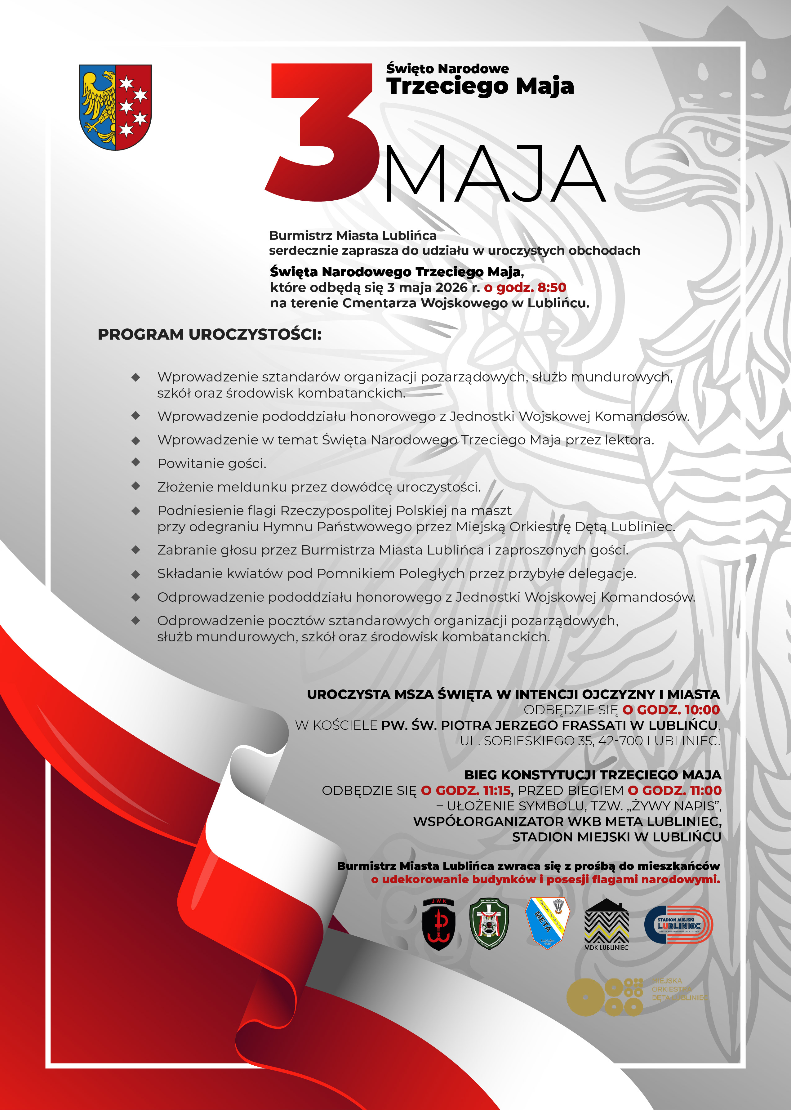 Burmistrz Miasta Lublińca serdecznie zaprasza do udziału w uroczystych obchodach Święta Narodowego Trzeciego Maja, które rozpoczną się 3 maja 2026 r. (niedziela) o godz. 8.50
