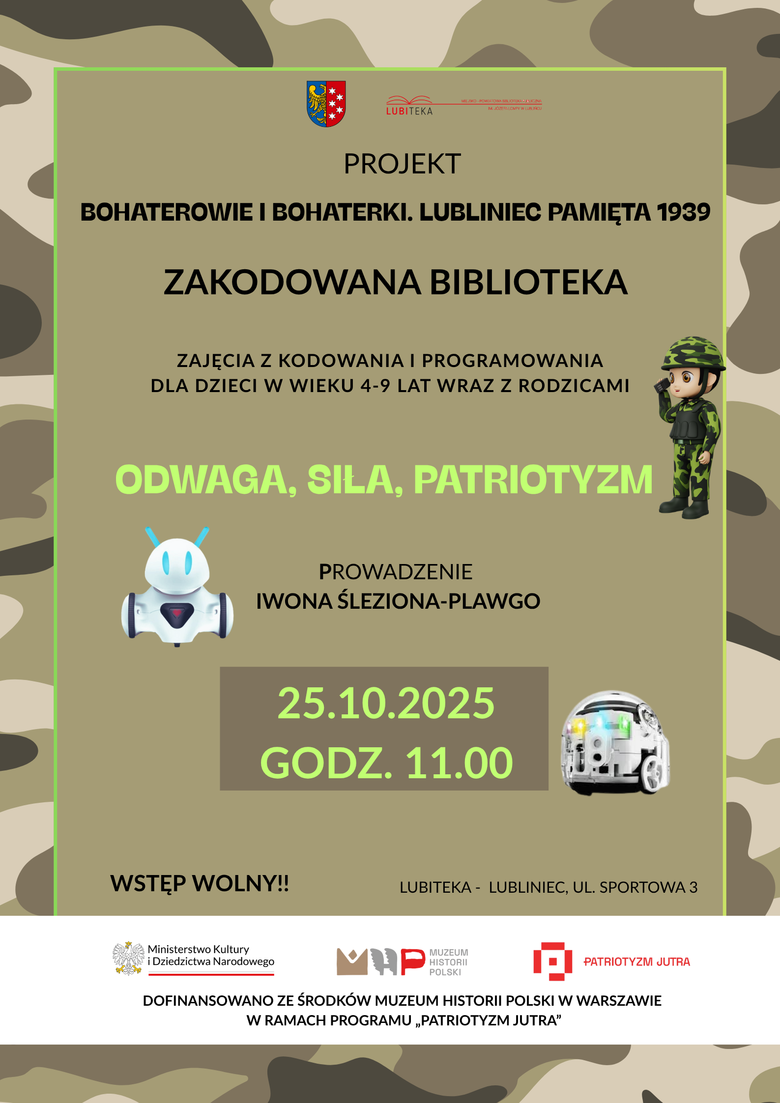 Zapraszamy dzieci w wieku 4–9 lat wraz z rodzicami do ZAKODOWANEJ BIBLIOTEKI na niezwykłe kolejne warsztaty z cyklu „Zakodowane wartości: Odwaga, Siła, Patriotyzm”